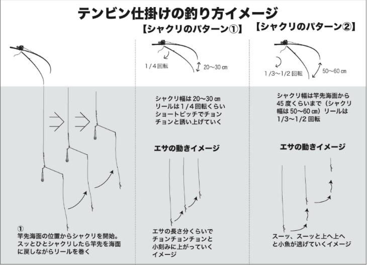 シャクリのスピードは活性の高い日にはスッスッと速いシャクリに反応し、食い渋り気味のときにはスローでネチネチとした誘いに反応することが多い。またときにはタナを決め打ちし、同じタナで時折フワフワさせるだけ、なんて誘いが有効なこともあり、大型狙いの常連さんの常套手段ともなっている。1日中同じ誘い方で通用することはまずない。同じパターンの誘いに反応しなくなったら、誘いの幅、スピードを変えていき、その時々に合ったパターンを早く見付けることが好釣果への鍵だ。