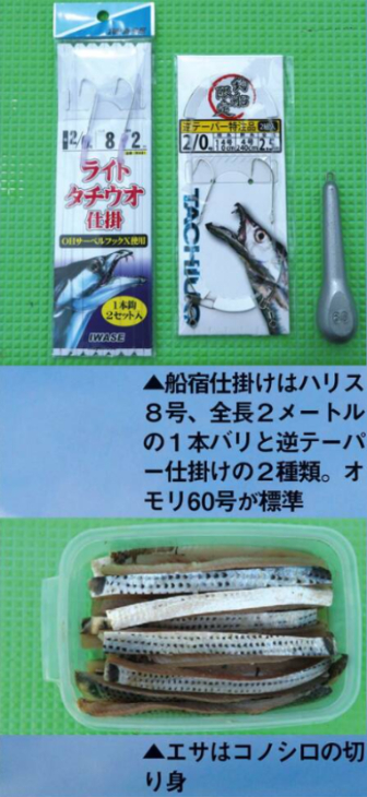 久里浜港 大正丸:タチウオは7月〜2月。タチウオショート乗合。浅場用ライトタックル錘30号用も忘れずに用意。道糸PE2号、オモリ30号~60号、ハリス4号~6号長さ2m、針1/0号~3/0号、1本針。
