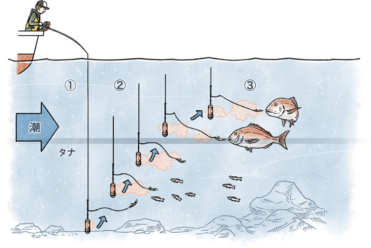 エサ取りとなる小魚とマダイを分離。離れて孤立したマダイを、潮の抵抗でポロポロと流れ出るコマセと付けエサを同調させて仕留めます。