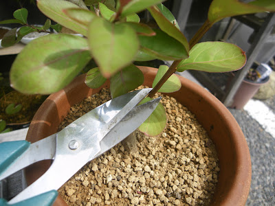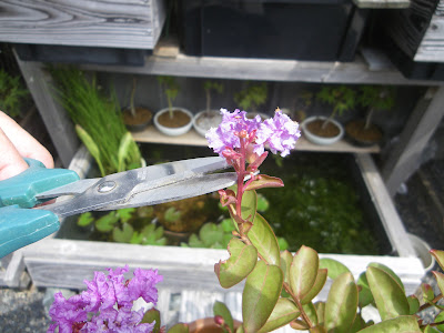 サルスベリの「夏剪定」は、8月初旬から~中旬には行うようにします。早い時期に花が咲いた枝の 花房下2~3節目 を切ります。