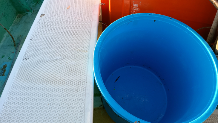 右ミヨシに大きなバケツがあって風が出ても仕掛けを入れら、足元も広く長い流水パイプがあるので、水が出た時に仕掛けを置いて居ても濡れて手前祭りしなそうです。