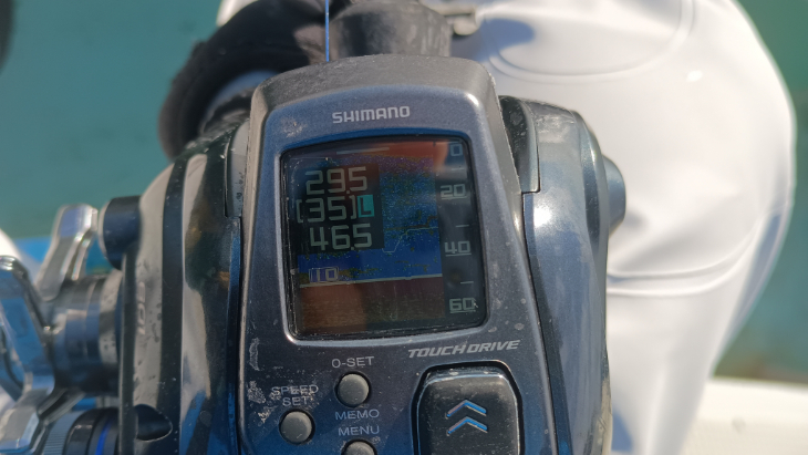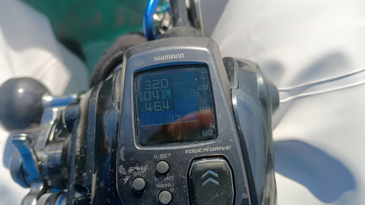 - 指示ダナで食わなかったので、電動リールから道糸を50cmつづ引き出して、止めて待つの繰り返して2〜3m落とし込んだのが良かった。