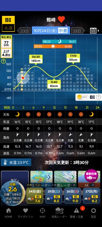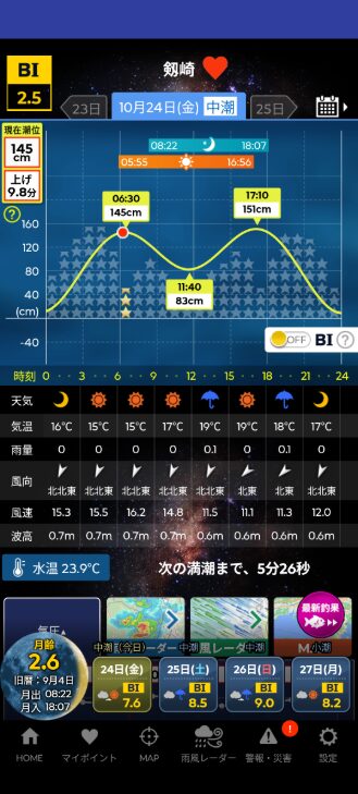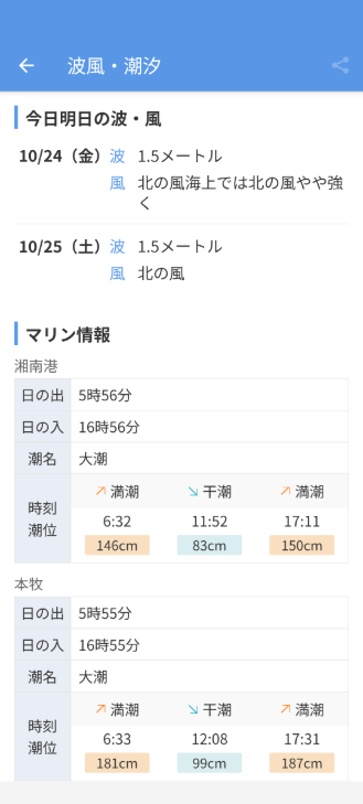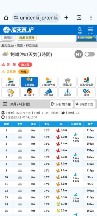「海天気.JP」の風予報は8.4〜6.3m/sだが、「タイドグラフ」の風予報が16〜12.7m/sになっている...気になる