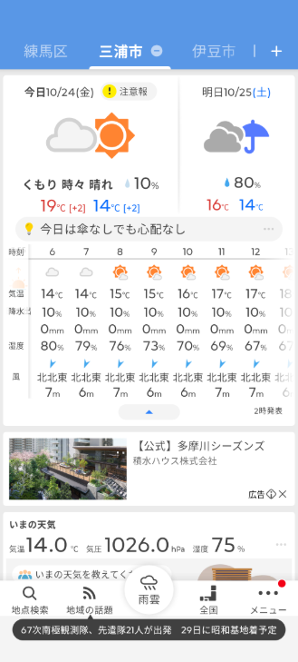 「ヤッフー!天気」三浦市の風予報は7m〜6mだが、波予報は1.5mだ...気になる、船出るかぁ