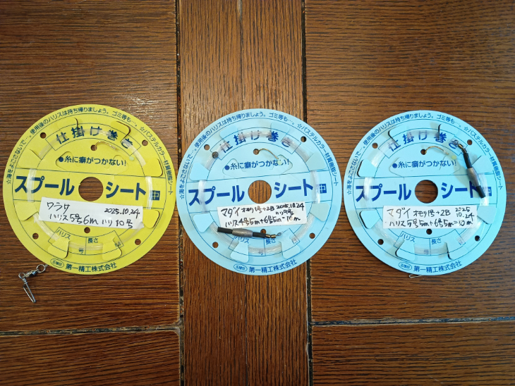 あまさけや丸のHPに『真鯛・ワラサ・青物軍団を狙える珍しい週になりそうです!ハリスは5号前後の6mなども良さそうです。』とあったのでマダイ用に先ハリス4号や5号に中間にオモリ1号、ハリから1mにガン玉2Bを付けた「とても重い仕掛け」10mとワラサ用に5号前後6mを準備しました。