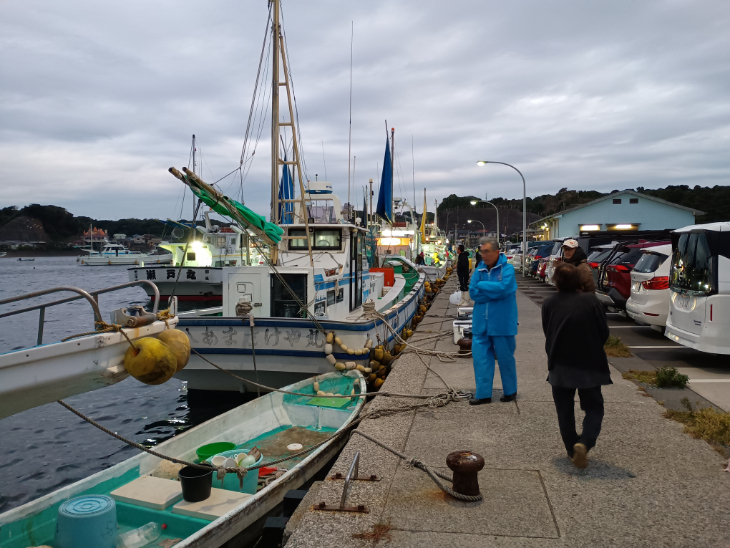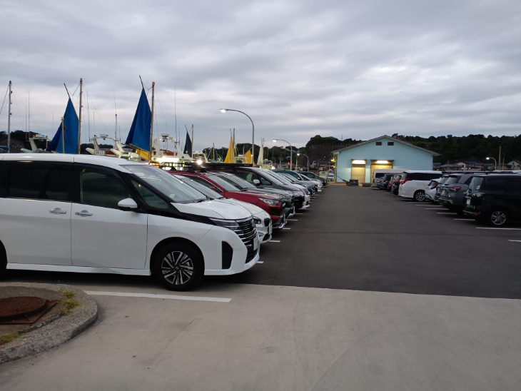 キハダカツオが釣れているので平日の割に釣り人が多かったが、岸壁側最前列残り1台に駐車できました。