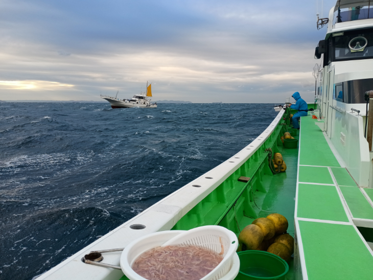 ドドッ〜んと船体が揺れて舳先が波に被って海水が腰から下に流れ込んで来ました。下半身びっしょりで、やる気が萎えたので後ろの船倉でちょっと休憩しました。オオドモでNさんと話してるとNさんヒット〜タモ入れに入ると...揺れで座席に置いておいたお昼の🍙おにぎり🍱がひっくり返って床に転がってました。踏んだり蹴ったり😥