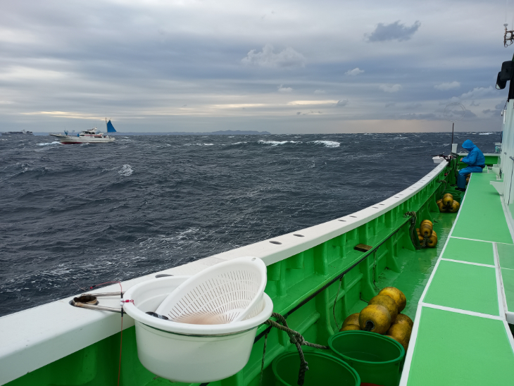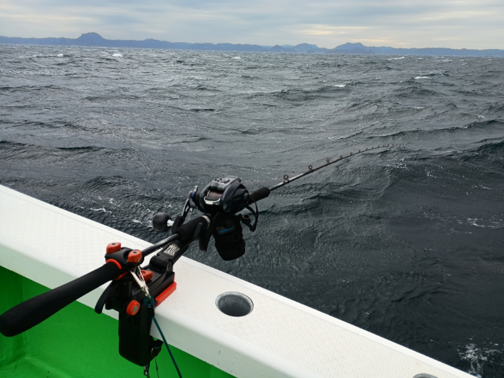 剣崎沖は波風強く、船が流されないようにエンジンをふかしているので余計に上潮がぶっ飛んでいる感じです。道糸が60°くらい傾いているので船長の指示ダナに届いているのか分からないし、誘い上げるにも波も1m以上あるのでミヨシではなかなか立っていられません。