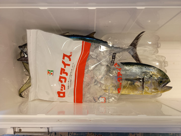 ペットボトル氷6本の上に魚を置いて、🏪コンビニでロックアイスを買い足して袋のまま上に置きました。氷が魚に直接当たる氷焼け防止になるし、溶けて水が滴っても魚が浸らないので魚の旨味も逃げません。