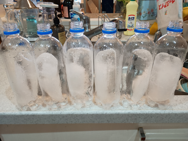 翌日、魚を捌いた後のペットボトル氷の溶けた水を抜いたところ、この時期、暑さも収まったので氷は6〜7割残って居ます。