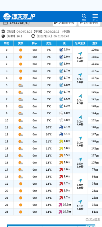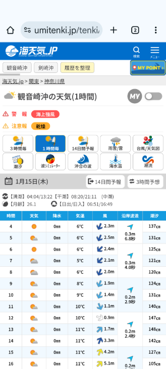 1/13 10:54 2日前...1/14(水)は朝うねりが残っている、1/15(木)の方が🌊波は低いが、午後風が強くなり波が高くなるかぁ🤔