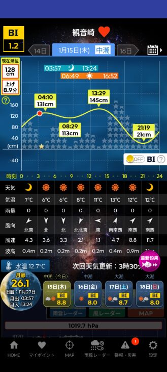 潮も落ち着く1/14(水)、15(木)、16(金)の内で、天候&海況(波)見て、中山丸/天秤タチウオ前日or前々日に予約するつもり。1/14(水)若潮、1/15(木)中潮なので、潮は緩めでgood、後は天候見ながら、前々日に決めましょう。両日とも天候不順なら延期します。