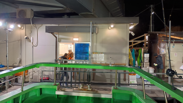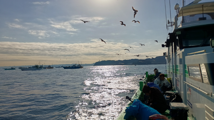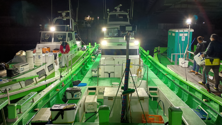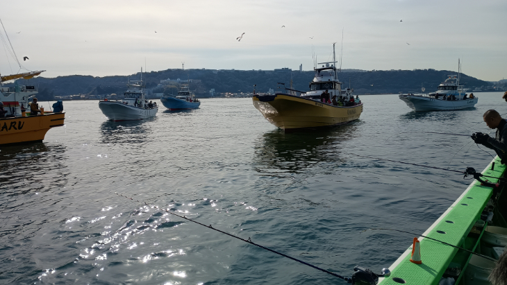 基本の釣り方は、下から上へ素早くシャクって元(下)位置に戻し、10〜15秒位待って聞き合わせる感じ。その日によって若干違う時もあるので、釣れてる人見て下さい。