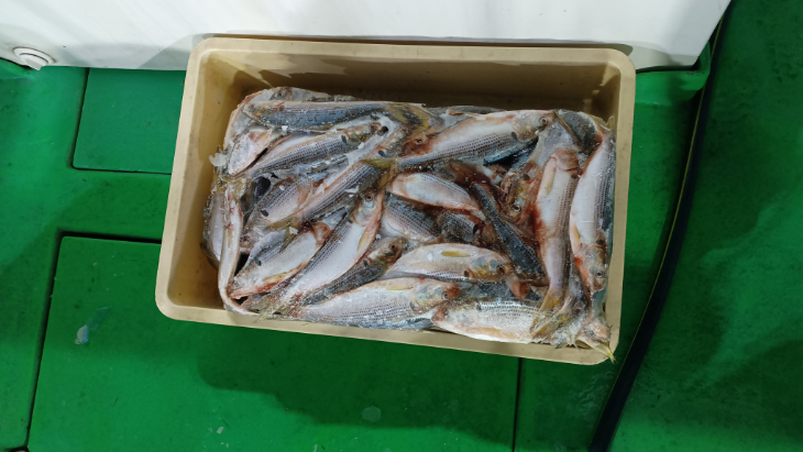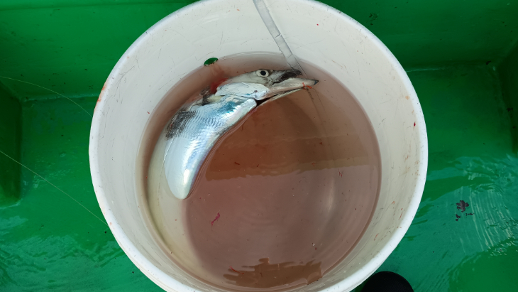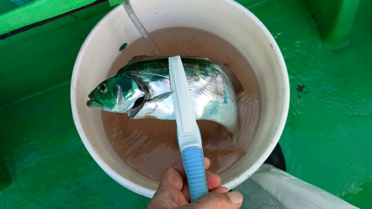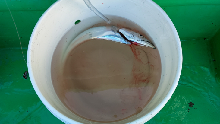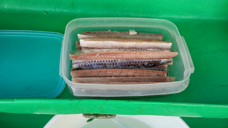 6:11 付けエサのコノシロ、今日は中乗りの大船長が、カットしてくれるようだ。