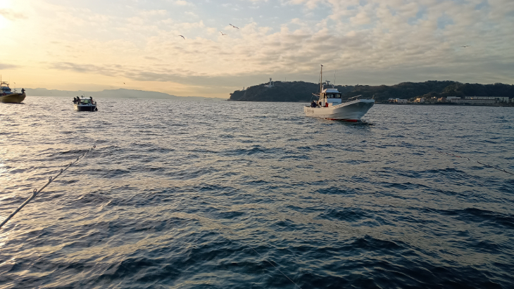 タチウオ釣り(餌・氷付き) 11,000円、🅿️5:30までに到着、座席確保は先着順、4:30開門時に順に船へ案内、不在同行者分の四つ角確保は禁止、並びでの座席確保、出船 6:45 予約制:Tel 044-233-2648 釣り場:観音崎 60〜70m、道糸PEライン:2号厳守、仕掛けは4号+チモト12号(10cm程)で全長2.5mの逆テーパー仕掛けの自作をお願い致します。(チモトワイヤー使用禁止) 針への結びは環を通さず軸結びでハリスとハリスの接続に金具を使うのはNGです。