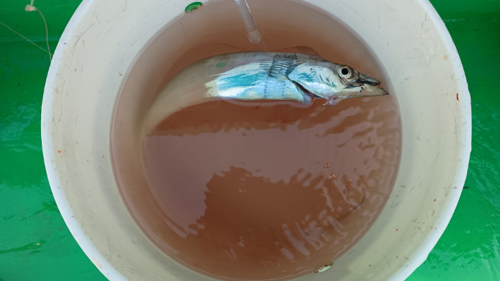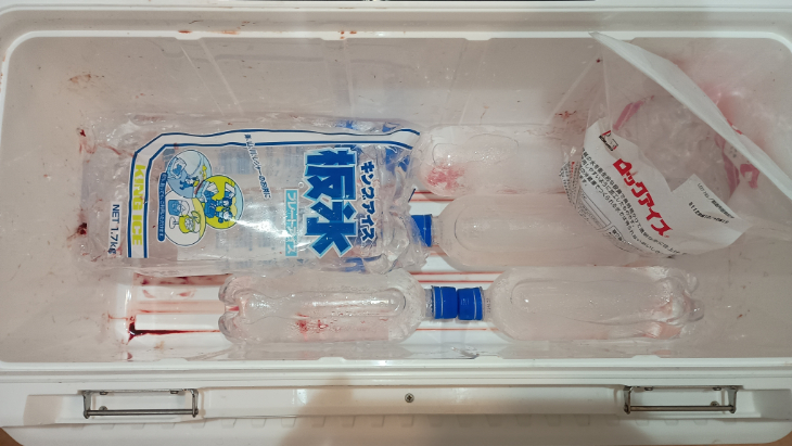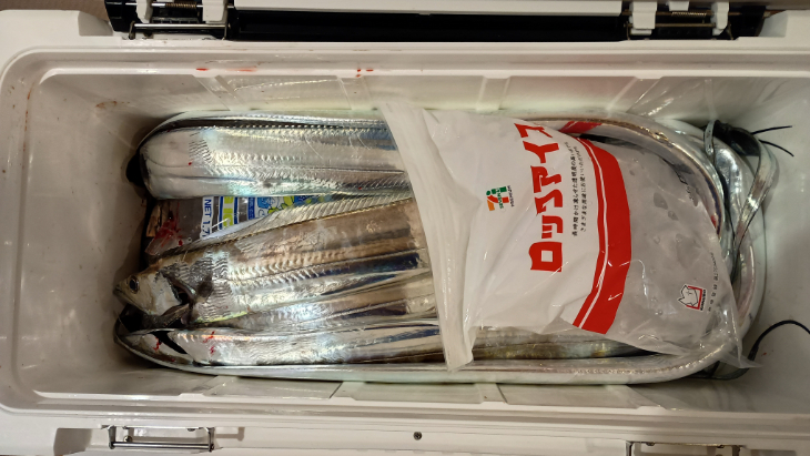 ペットボトル氷6本敷いた上に、船宿支給の氷を袋ごと置いた上に血抜きしたタチウオを載せて行きます。