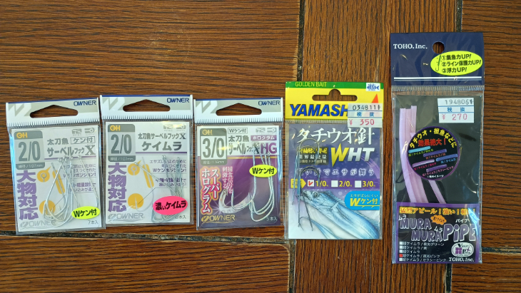 大型タチウオにハリを飲ませて釣った場合にチモトハリスが傷だらけになるので、ハリにチモトハリスを結んだセットを10個程作っておくと交換が楽だそうです。...仕掛け5セット作るのに半日かかってしまい力尽きましたぁ、船上で1個100円で売っているそうなので、一安心。