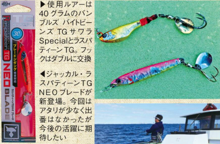 イチ押しルアーは人気・実績抜群のブレードジグ。サワラ用にチューンされたブレード付きジグやテールスピニングジクで投げて巻くだけで釣れる。小さくて自重があるので向かい風でもよく飛び、早巻きしても海面から飛び出さず、バランスを崩さずに泳ぐ。ブレードが回転することでフラッシングによるアピール度が高いし、サワラが捕食しているベイトのサイズにマッチしている。サワラが表層に浮いているときは30g、水深15〜25mでは40g、水深30〜35mなら50gを選べばOKだ。...船長によるとスナップ付きスイベルはルアーの動きが安定しなくなるそうなのでスイベルが付いていないものを選ぼう。外れにくいクロスロックスナップがお勧め。