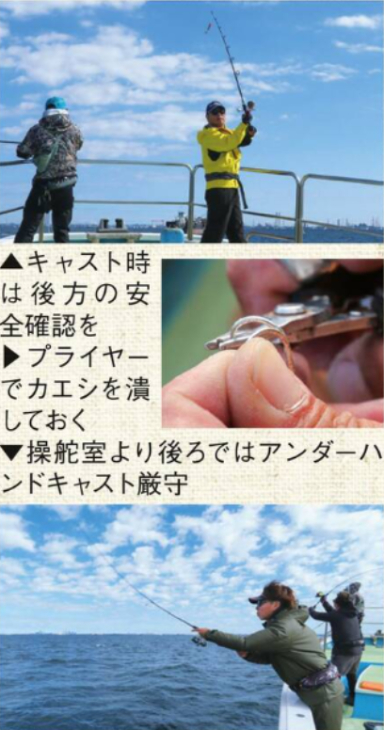 安全の為、アンダーハンドキャスト限定となっている船宿が多い。アンダーハンドキャストは右舷の場合、利き手でリールシートを、逆の手でグリップエンドを握り、竿を下に(竿先が海面に届く時は斜め下45度くらい)に構える。ルアーのたらしは20cmはどにして、リールのベールを起こし、人差し指の腹に道糸をかける。投げる時は一気に利き手を押し出しつつ、逆の手のグリップを引き、竿を振り上げて人差し指を放すと竿がしなり、ルアーが勢いよく前方へ飛んで行く。人差し指を放すタイミングが遅れると上に飛んでしまうので気を付けよう。