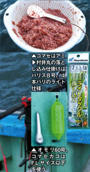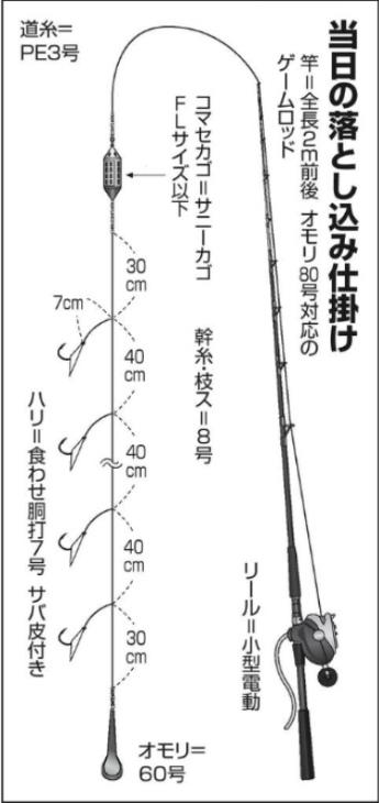 ライト落とし込み船 タナ 20〜100メートル前後、落とし込み道具(PE2〜3号)、オモリ50〜60号、コマセカゴはサニーカゴFL。