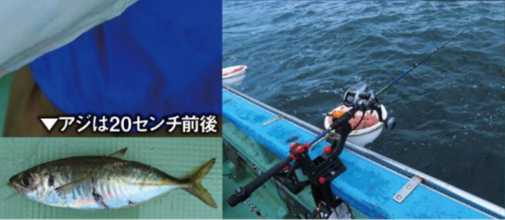 釣り場は保田沖の水深90〜100mと保田港前や竹岡沖の水深10m前後を状況により釣り分けている。浅場狙いはハリス8号、4本針のライト落し込み仕掛けを使い、アジを食わせても落とし込まずにそのままのタナでアタリを待つ。