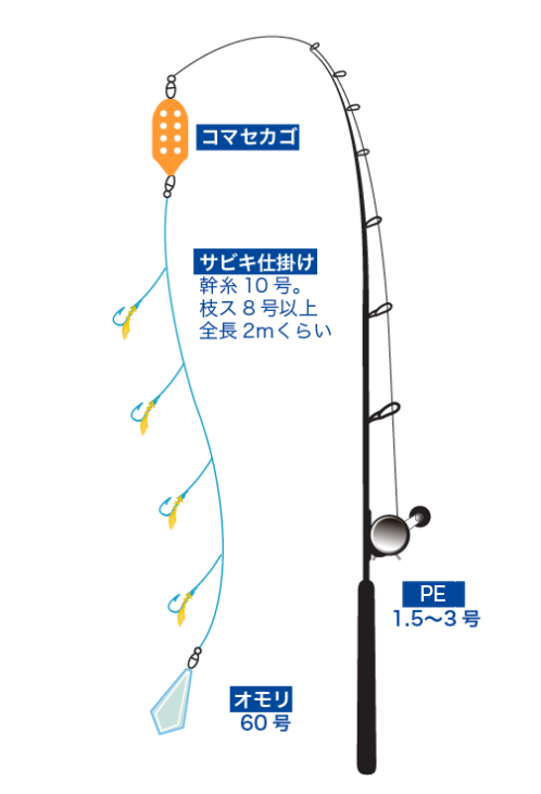 サビキ仕掛けを用います。道楽仕掛けは禁止です。幹糸10号、枝ス8号以上で。