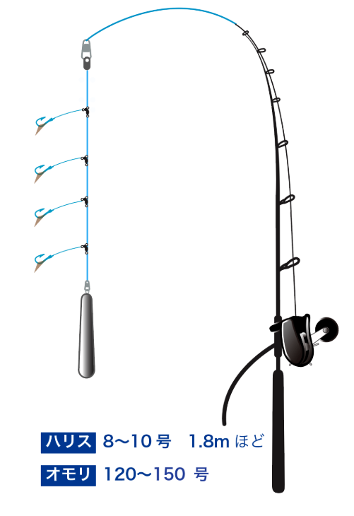 タックル 胴調子竿、PE3〜6号。オモリ120〜150号。タナ 100〜150メートル前後。